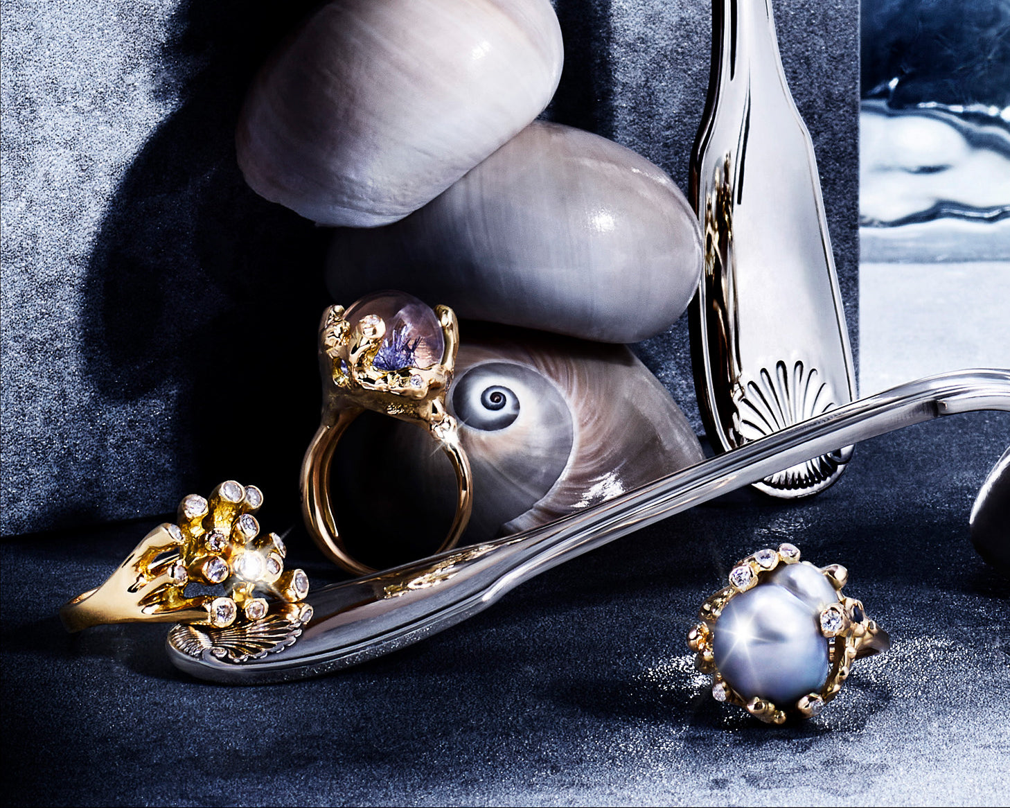 Rooted in Kimberlin's childhood along the Connecticut seashore, this collection is an ode to the ocean's opulence and celestial grandeur. Sculptural forms echo the sinuous elegance of coral branches, while diamond-studded sea anemones shimmer amid radiant pools of hand-selected gemstones. Each piece is meticulously crafted, balancing organic movement with refined brilliance.