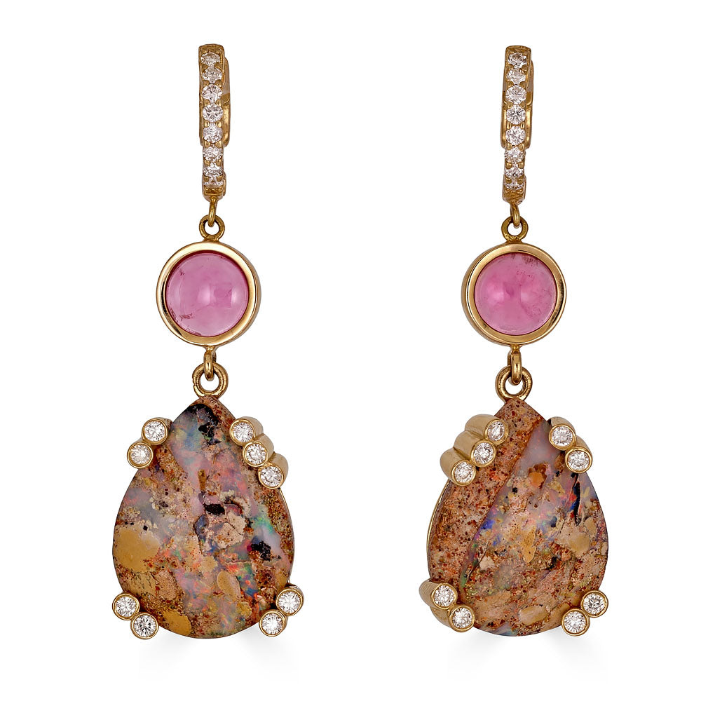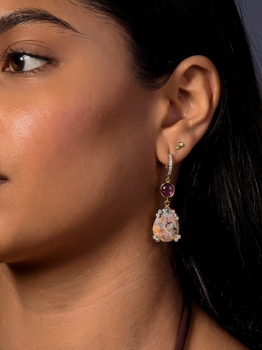 Otherworldly Australian Opals reminiscent of an illuminated moonscape set in 14k Gold with Diamond prong accents. Pink Tourmalines compliment beautifully while sparkly Diamond Huggie Hoops keep these lightweight dangly delights securely in the ear.