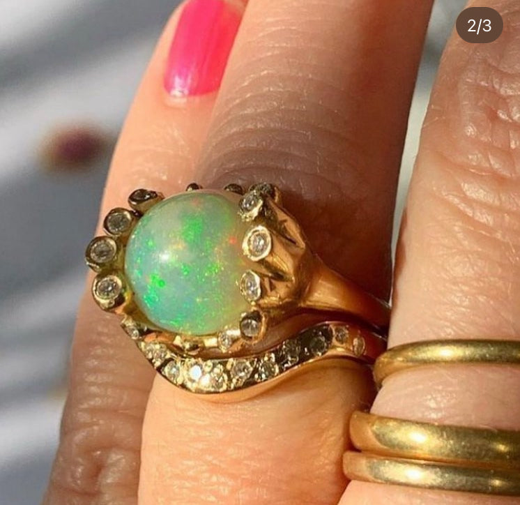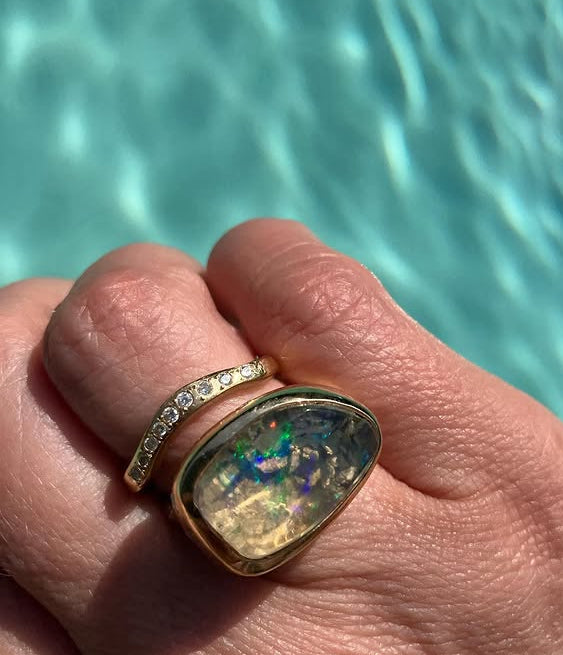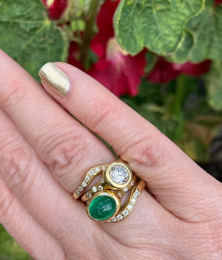 The Crescent Moon Band is a beautiful hand carved flowing design that nestles well in a wedding set or with any solitaire ring. Pavé set with 7 sparkly Diamonds it resembles a  bright sliver of a moon adding delightful dazzle to your collection.
