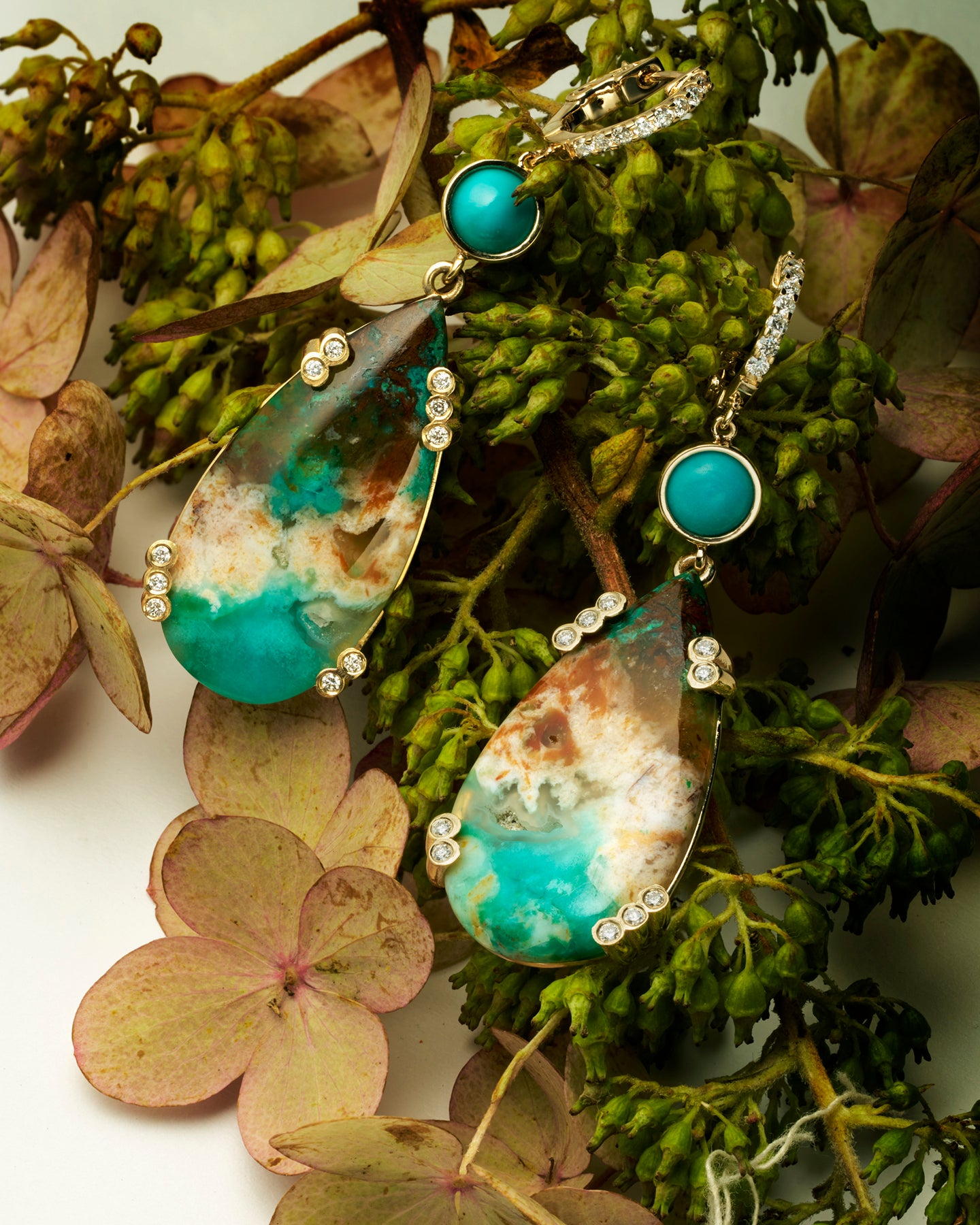 A truly magical stone Gem Silica is the most valuable and rare variety of Chalcedony, prized for its vivid blue-green color caused by copper inclusions. This unique pair from Australia are custom cut and hand set into 14k Gold with Diamond prongs accents. Persian Turquoise in a beautiful Robin egg blue compliment beautifully while sparkly Diamond huggie hoops keep these lightweight dangly delights securely in the ear.