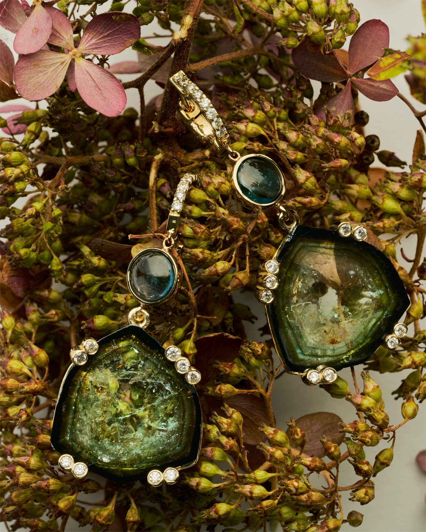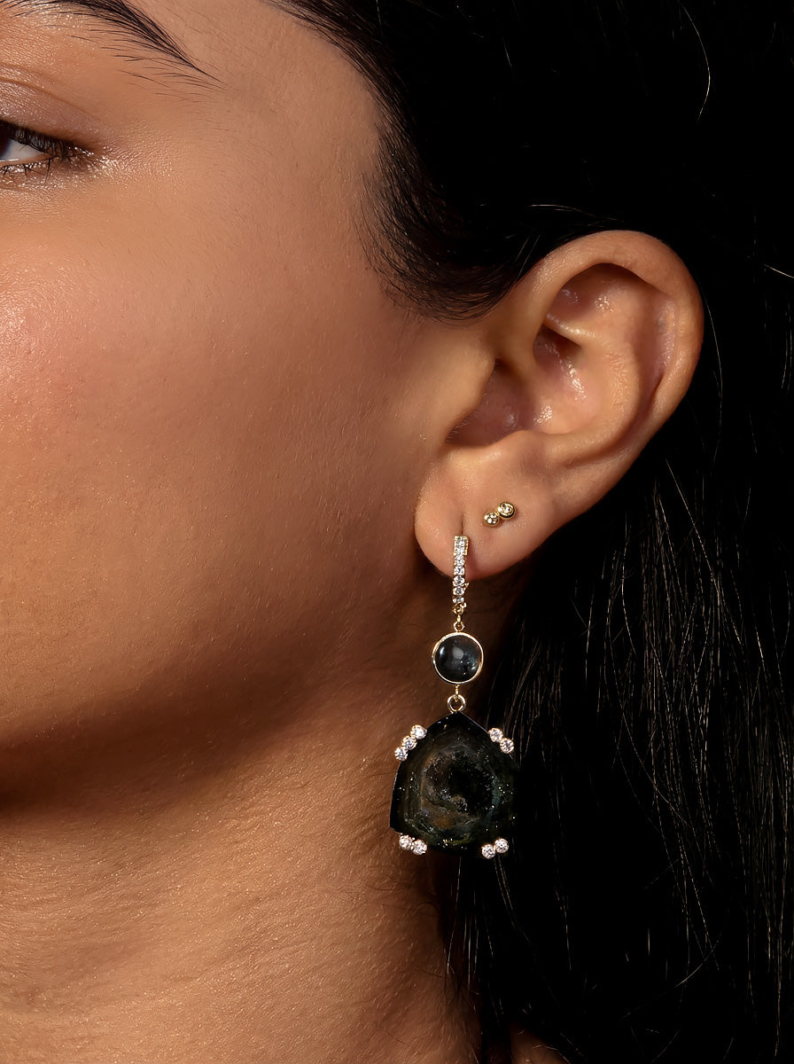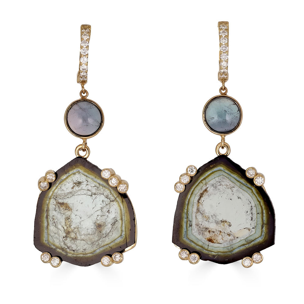 Green Tourmaline custom cut into unique looking glass slices are set in 14k Gold with Diamond prong accents. Beautiful blue/green Indicolite Tourmalines compliment beautifully while Diamond huggie hoops keep these lightweight dangly delights securely in the ear.