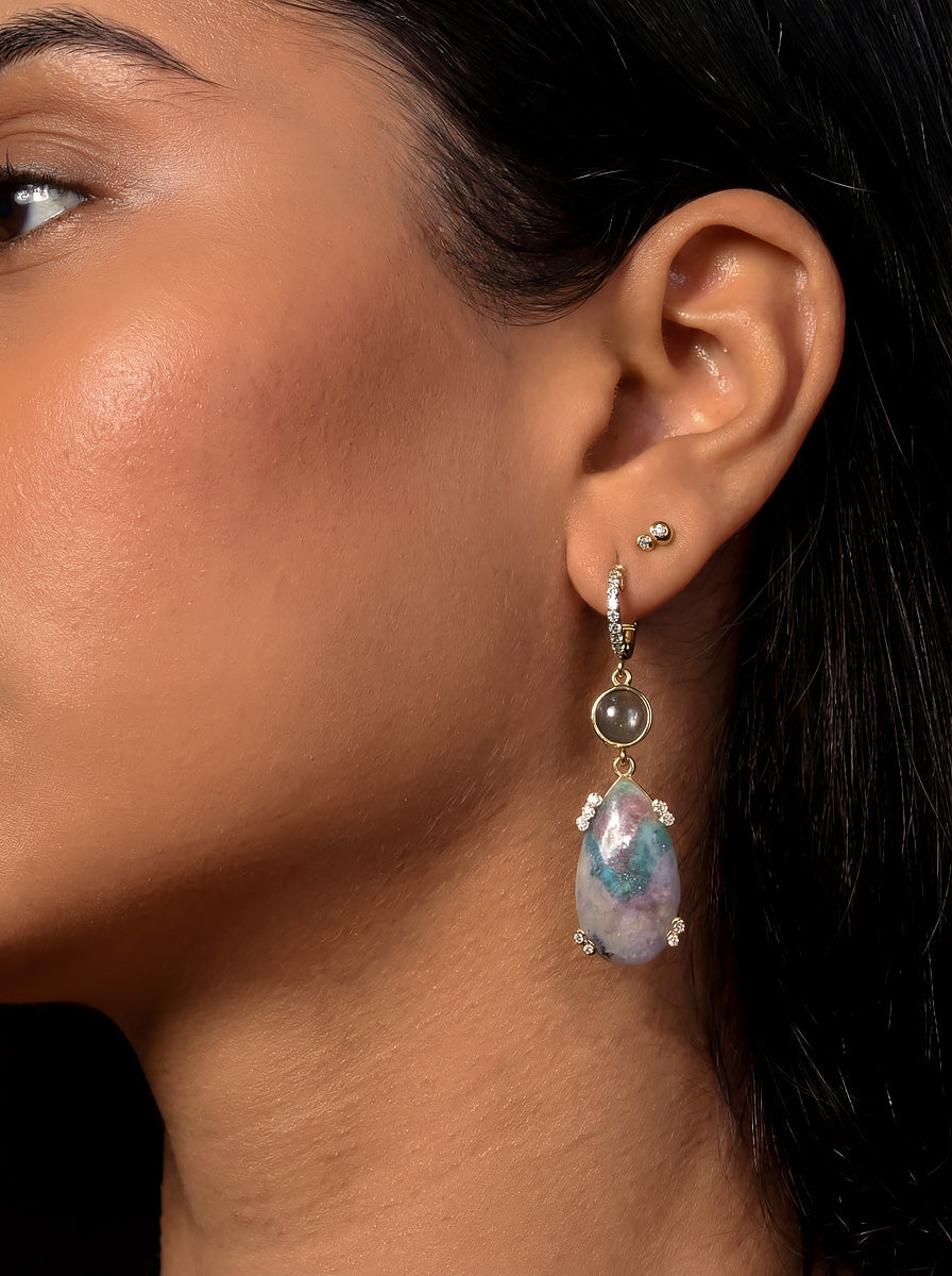 Otherworldly Paraiba Tourmalines in a pattern of pastel lilac and cornflower blue set in 14k Gold with Diamond prong accents. Pale blue Tourmalines compliment beautifully while sparkly Diamond Huggie Hoops keep these lightweight dangly delights securely in the ear.